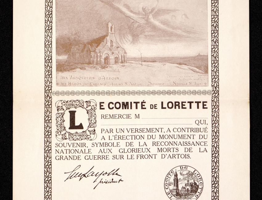 Souscription pour l’achèvement du monument de Notre-Dame-de-Lorette. Carte de souscription. Archives départementales du Pas-de-Calais, 42 J 273.