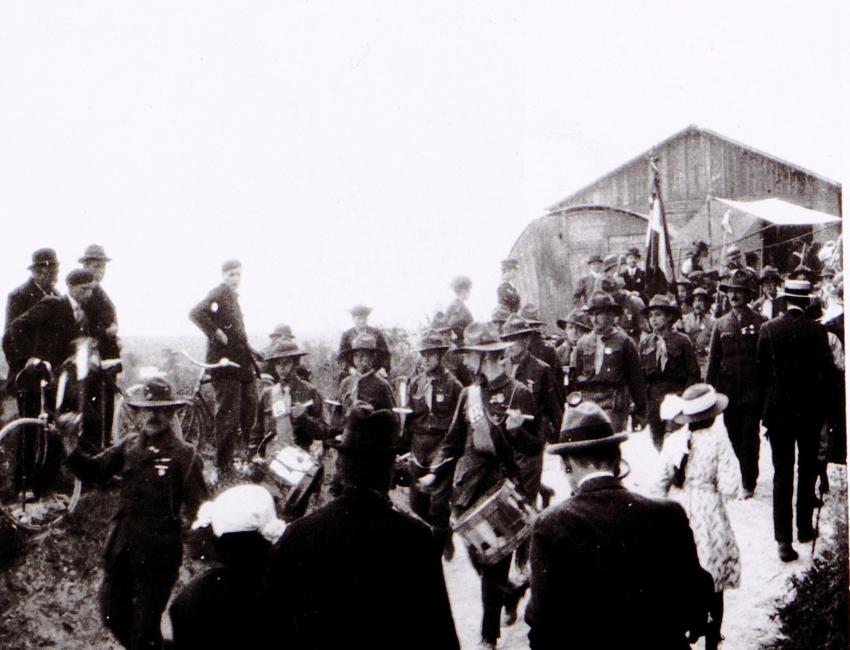Soldats australiens ou néo-zélandais (?) défilant à Lorette. Archives départementales du Pas-de-Calais, 4 FI 1858.