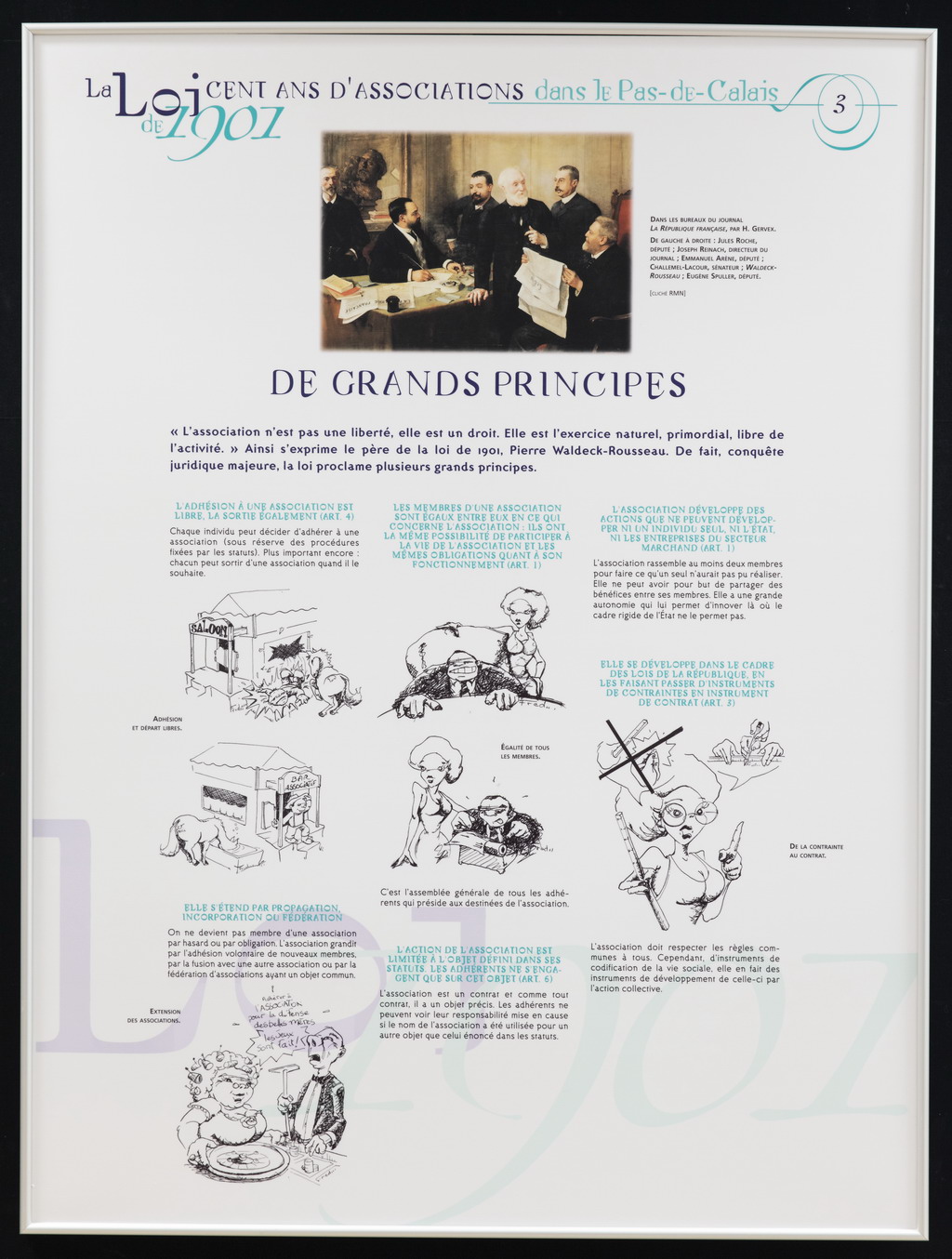 Afin d'inviter à la découverte ou redécouverte du statut forgé par la loi de 1901, mais aussi d'ouvrir la réflexion sur l'avenir des associations du XXIe siècle, cette exposition propose trois thèmes répartis sur 12 panneaux :