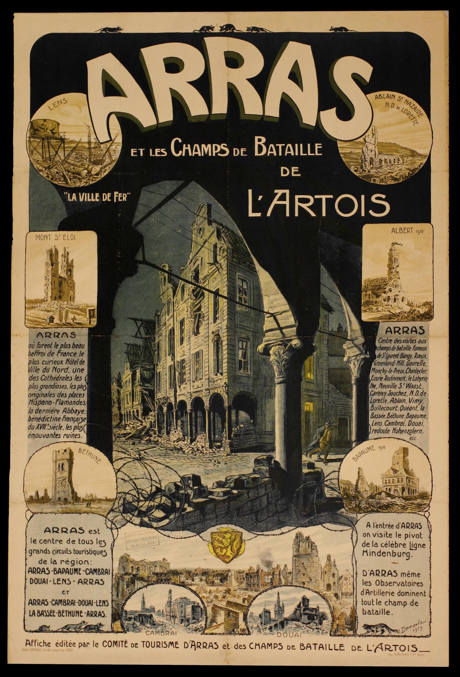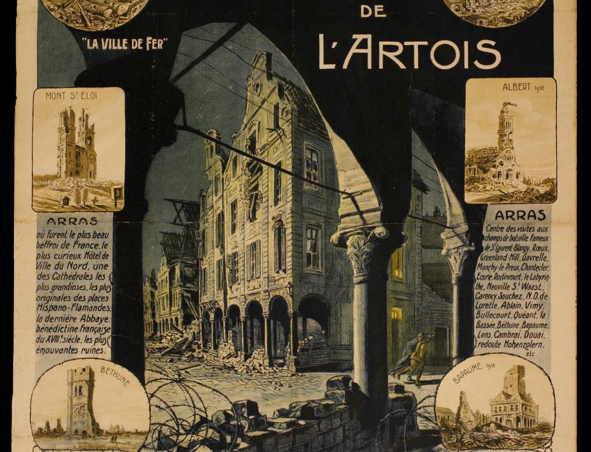 Arras et les champs de bataille de l’Artois, affiche lithographiée, 1919. Archives départementales du Pas-de-Calais, 17 FIB 901.