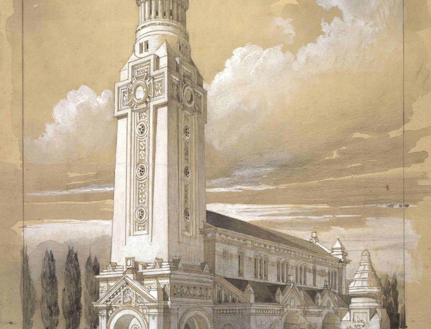Projet de basilique et de tour lanterne pour le cimetière national de Notre-Dame-de-Lorette, par l'architecte Louis-Marie Cordonnier. Archives départementales du Pas-de-Calais, 3 FI 710.