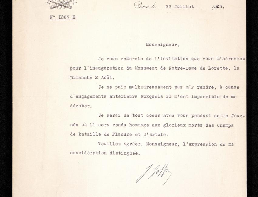 Courrier adressé à Monseigneur Julien signé du Maréchal Joffre, 22 juillet 1925. Archives départementales du Pas-de-Calais, 42 J 346.