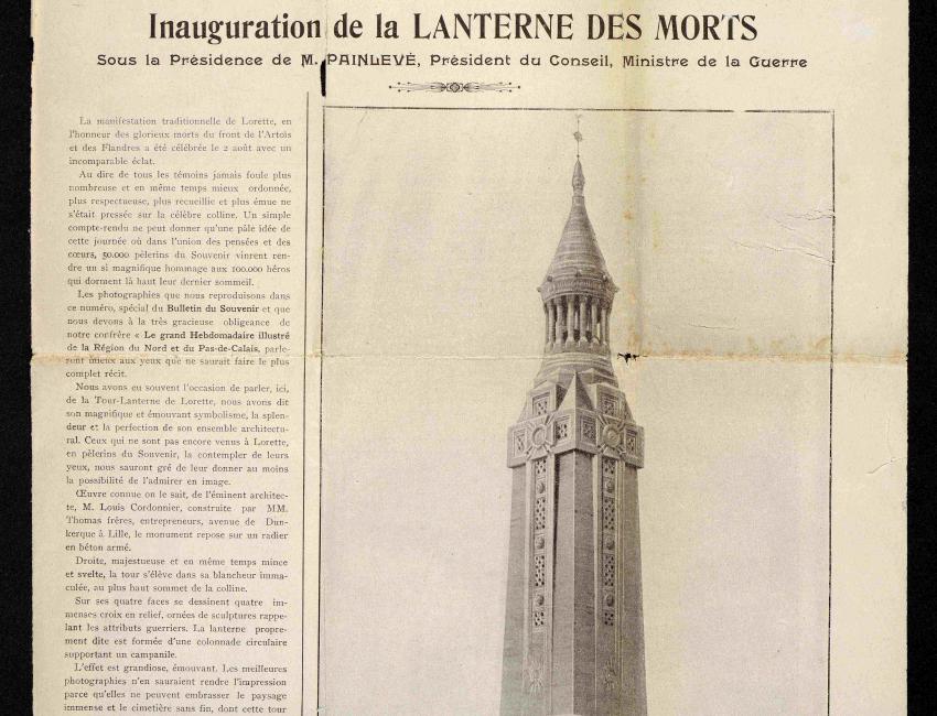 "La manifestation patriotique du dimanche 2 août 1925. Inauguration de la Lanterne des morts, sous la présidence de M. Painlevé, Président du Conseil, ministre de la Guerre". Bulletin du souvenir, édition spéciale. Archives départementales du Pas-de-Calais, 42 J 346.