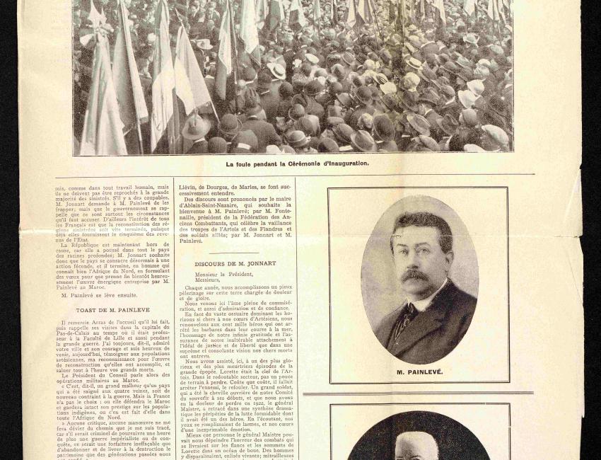 "Toast de Painlevé. Discours de Jonnart." Bulletin du souvenir, édition spéciale. Archives départementales du Pas-de-Calais, 42 J 346.