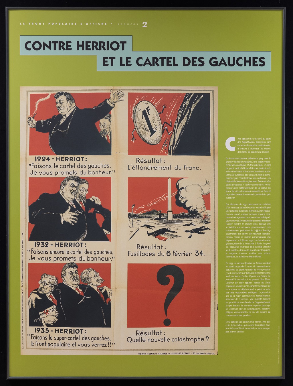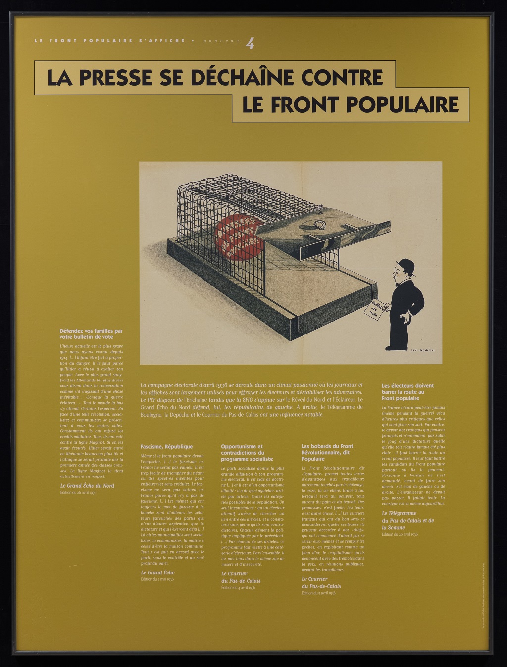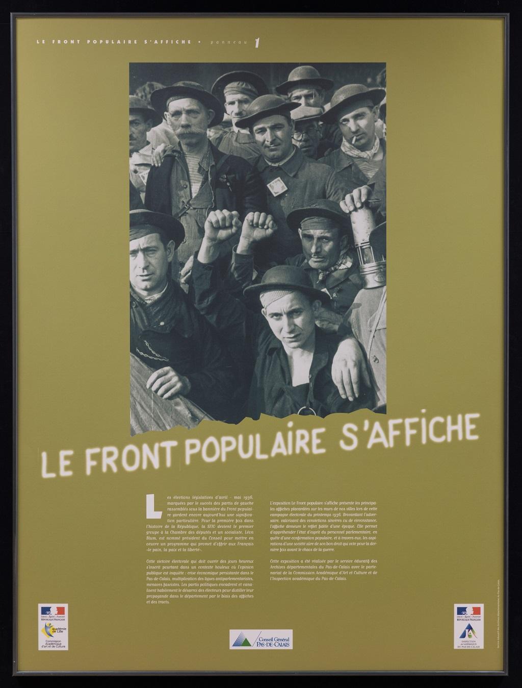 Cette exposition de 11 panneaux présente les principales affiches placardées sur les murs de nos villes lors de cette campagne électorale du printemps 1936. Brocardant l'adversaire, valorisant des convictions sincères ou de circonstance, l'affiche demeure le reflet fidèle d'une époque. Elle permet d'appréhender l'état d'esprit du personnel parlementaire, en quête d'une confirmation populaire, et à travers eux, les aspirations d'une société sûre de son bon droit qui vote pour la dernière fois avant le chaos de la guerre.