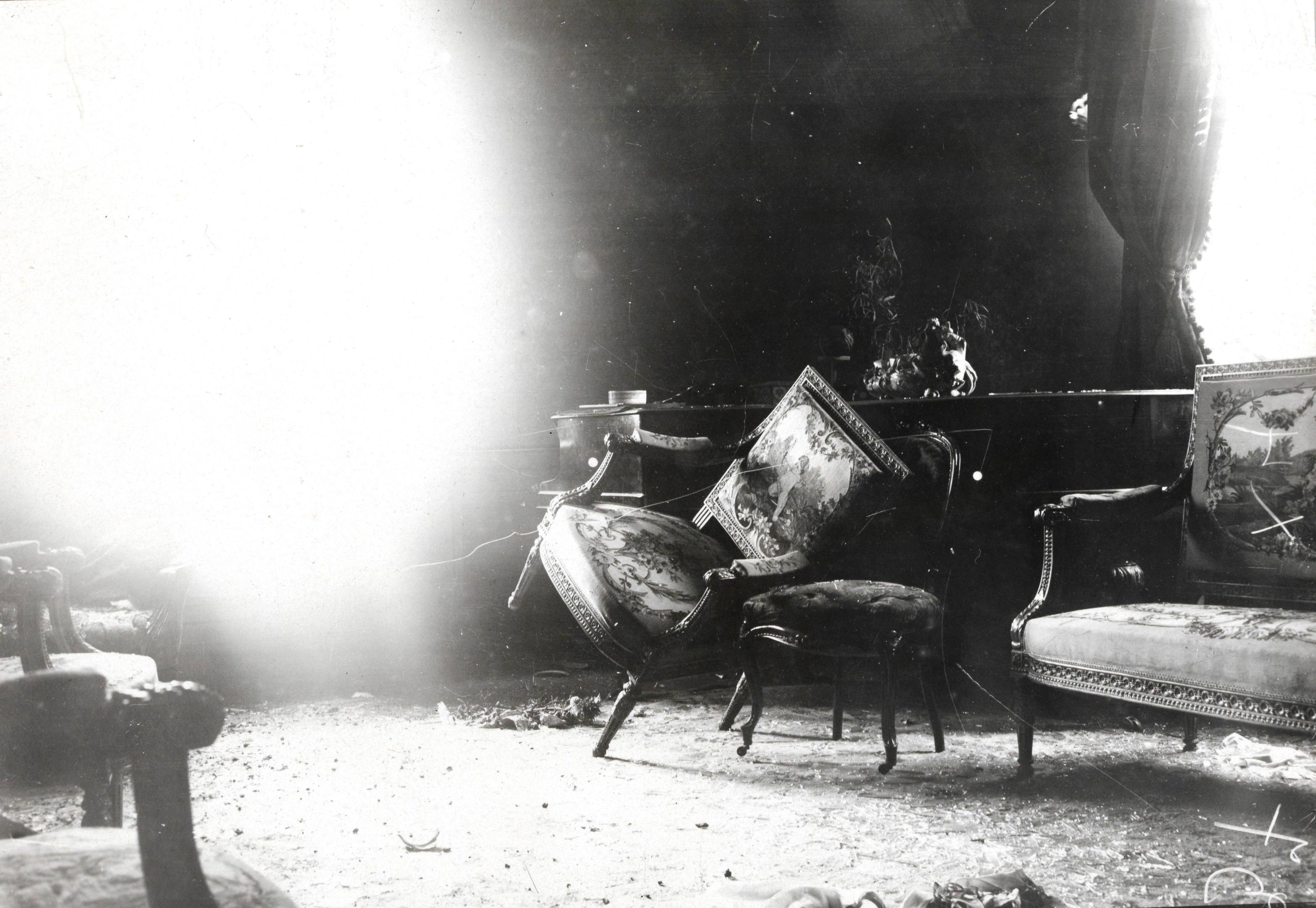 Nœux-les-Mines. Effets d'un obus chez M. Berthelemy, directeur des Mines. Fauteuil renversé dans le salon, en contre-jour. Photographie, Service photographique et cinématographique de l'Armée, [24 novembre 1915 - 27 novembre 1915]. Archives départementales du Pas-de-Calais, 8 Fi 1027. @droits réservés
